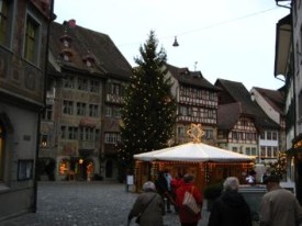 Stein am Rhein carece de mercadillo navideño como tal. Había alguna que otra caseta solitaria –otras estaban aún en construcción- pero al caer la noche –a las cinco ya es totalmente oscuro- las luces navideñas daban una atmósfera muy particular a la ciudad.
