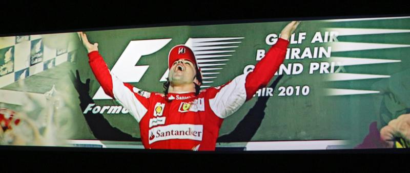 Tras subir a la planta superior accederemos a la gran pantalla que nos proyecta imágenes de los momentos más representativos de la carrera de Fernando Alonso en la F1.