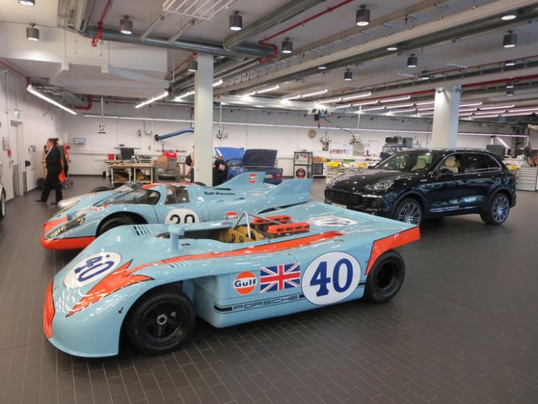 Mi visita al "Porsche Museum" no pudo empezar mejor. Tuve el privilegio de tener "acceso privado" al taler del museo gracias a la invitación del museo por mi condición de webmaster y ello no sólo me permtió apreciar en vivo y en directo cómo trabajan y acondicionan los coches, sino que pude estar junto a uno de los modelos míticos de Porsche y del cine. Un auténtico icono de mi infancia, cuando competía con mi "Porsche 917 Gulf" de Scalextric en los campeonatos de mi colegio. De no haber sido así, hubiera tenido que conformarme con verlo "a distancia y de mala manera" a través de la vidriera que separa al taller del vestículo. Y yo que deseaba que el Porsche 917 K estuviera expuesto...