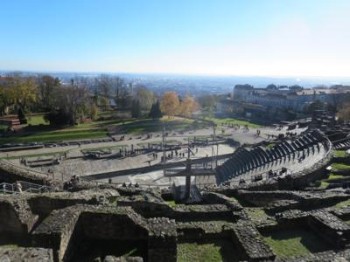 Casi toda la mañana la dedicamos a la basílica de la Fourvière –cuya arquitectura recuerda muchísimo al Sacré Coeur de París- y al anfiteatro romano. Ambos monumentos son gratuitos. Desde la plazoleta junto a la basílica se dispone de una espectacular vista sobre la ciudad, los dos ríos –el Saône y el Rhône- y la campiña circundante. Lástima que por la mañana el sol da frente y tanto las vistas como las fotos quedan peor.